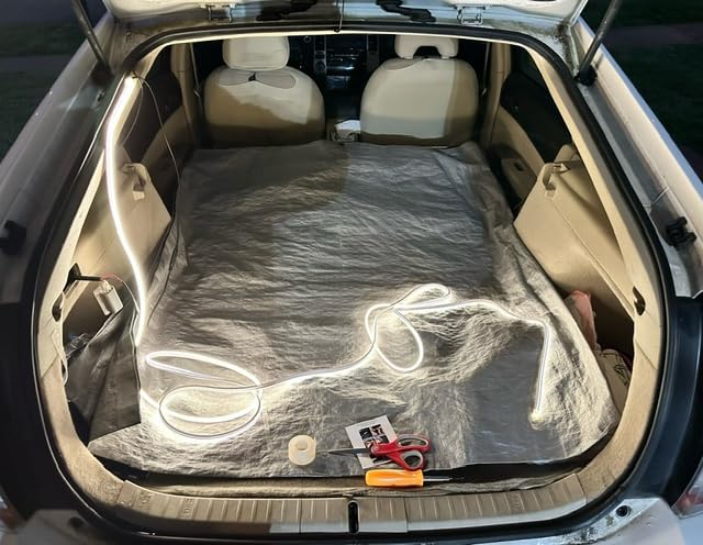 Peel, stick, and secure the LED strip along the hood or trunk edge.
